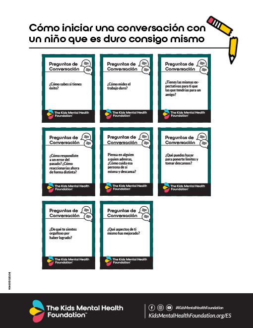 Use these conversation starters with kids to think about ways they may have been too critical of themselves. They can think about how their measure of success and hard work may be too difficult or how they would not expect the same from friends. Encourage them to create positive thoughts about themselves and help them feel proud of what they’ve done already.