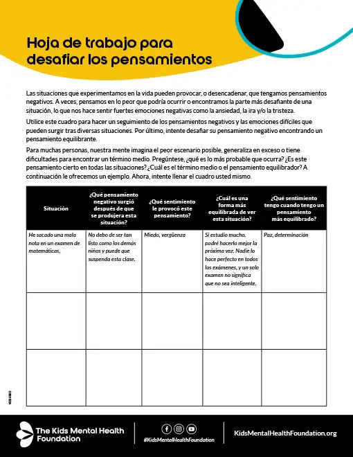 Desafiar los pensamientos es una herramienta que se utiliza a menudo en la terapia para revisar y cambiar los pensamientos negativos que nublan nuestra visión. Para los niños que luchan con ansiedad y depresión, el pensamiento excesivamente negativo puede convertirse en un hábito difícil de romper o incluso de reconocer. Desafiar los pensamientos nos ayuda a darnos cuenta de que nuestra primera reacción no siempre se basa en hechos, y tenemos el poder de decidir qué pensar cuando enfrentamos nuevos desafíos en la vida. La vida nos seguirá dando momentos difíciles, pero el desafío de pensamientos otorga a los niños el poder sobre sus respuestas a situaciones estresantes.