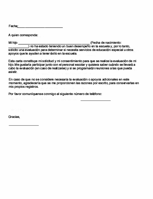 Si crees que tu hijo está por debajo de lo esperado y podría beneficiarse de apoyos escolares adicionales, puedes usar una carta modelo para solicitar que se le realice una evaluación psicoeducativa. Junto con la carta, puedes incluir cualquier diagnóstico o información relevante que ya tengas. Llena la carta, entrégala al maestro o a la dirección escolar y guarda una copia para tus registros.