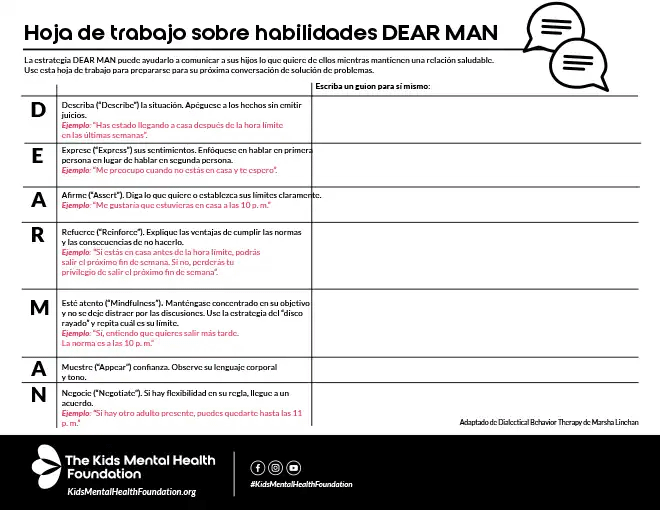 ¡Descarga nuestra hoja de trabajo de la estrategia DEAR MAN de Kids Mental Health Foundation!