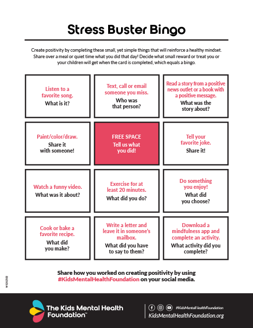 Put your positivity into practice by trying out our Stress Buster Bingo! Complete these small, yet simple things that will reinforce a healthy mindset. It only takes 5 minutes or less to do and you can practice multiple times per day if you want.